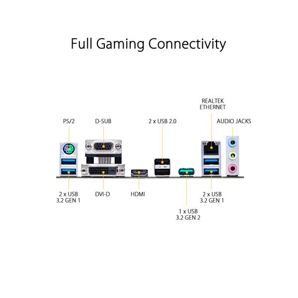 4 x USB 3.2 Gen 1 ports (4 x Type-A) 2 x USB 2.0 ports (2 x Type-A) 1 x DVI-D 1 x D-Sub 1 x HDMITM port 1 x Realtek L8200A 1Gb Ethernet port 3 x Audio jacks 1 x PS/2 Keyboard/Mouse combo port |